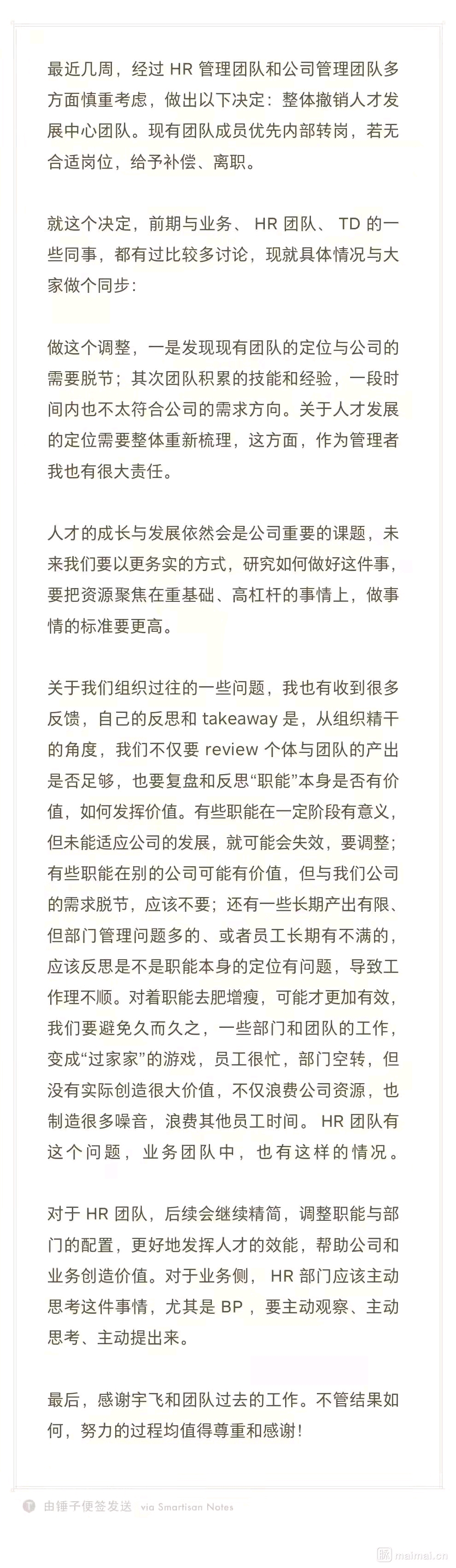 此前在商业化、教育、游戏等多条业务线开启裁员的字节跳动,选择继续“精简”职能部门。 12月14日,澎湃新闻记者获取的字节跳动内部邮件显示,字节跳动已于近日整体撤销人才发展中心团队,现有团队成员优先内部转岗,若无合适岗位,给予补偿或离职。 人才发展中心,指的是人力资源部门旗下的培训团队,主要负责新员工、供应商管理等培训工作。在内部邮件中,字节跳动表示,在做出此决定前,和相关业务同事有较多讨论,最终调整是因为:一是发现现有团队的定位与公司的需要脱节;其次,团队积累的技能和经验,一段时间内不太符合公司的需求方向。 ![]() 该内部邮件中提到:“有些职能在一定阶段有意义,但未能适应公司的发展,就可能会失效,要调整;有些职能在别的公司可能有价值,但与公司的需求脱节,应该不要;但有一些长期产出有限,但部门管理问题多的、或者员工长期有不满的,应该反思是不是职能本身的定位有问题,导致工作理不顺。” “有一些部门和团队的工作,变成‘过家家’的游戏,员工很忙,部门空转,但没有实际创造很大价值,不仅浪费公司资源,也制造很多噪音,浪费其他员工时间。”内部邮件中还表示。 据了解,字节计划后续继续精简HR部门,并调整职能与部门的配置。“人才的成长与发展依然会是公司重要的课题,未来我们要以更务实的方式,研究如何做好这件事,要把资源聚焦在重基础、高杠杆的事情上,做事情的标准要更高。”字节跳动表示。 澎湃新闻记者就此事向字节跳动求证,截至发稿尚未收到回应。 值得注意的是,新任字节CEO的梁汝波曾任字节的CHO(人力资源总监),负责公司的人力资源和管理等工作,推动字节跳动的组织建设和人才发展,在他担任CHO期间,字节跳动的员工数量有了大幅增长。 此前,字节跳动HRBP阿水也曾发文表示,2018年底以来,字节的HR就已经在转型,招聘不再是工作重心,会花大量的精力做人才发展和组织文化。她也提到,字节此前十分注重员工人数的增加。“刚给国际化招人的时候,HR负责人开会就指着地图上的那个地区说,‘你看看DAU涨到多少了,那里的XX团队还没有人呢!’我就赶紧去。从来没见过像做增长一样做招聘。” 有业内人士分析称,在HR部门中,培训行业是反映整体环境景气程度的指标之一。“一旦业绩好,所有部门都会要求增加培训,而业绩不好,培训这个不能直接创造收益的部门就会被裁掉,就像字节跳动此次的行为。” 此番撤销“人才发展中心”,或为互联网年末裁员潮的延续。 此前,有媒体报道称爱奇艺正在裁员,裁员比例约在20%至40%,裁员补偿尚未完全敲定,或按N+1发放。快手内部人士也告诉澎湃新闻记者,快手开启内部新一轮优化和裁员,在北京、上海、广州、深圳四地的商业化团队将在年底前完成转型,其中部分业务条线将被取消。 此前,字节跳动曾向澎湃新闻记者确认,在商业化、游戏、教育等业务条线均有裁员。商业化方面,字节对商业化团队进行了一系列的组织架构、业务范围调整。其中温州本地直营中心率先撤城裁员;教育方面,受双减政策影响,字节教育旗下瓜瓜龙、清北网校、学浪、硬件、校园合作等多个业务都已经开启裁员;游戏方面,旗下Ohayoo平台被曝光裁撤应届生,其中23名同学已内部转岗,3名同学在内部协调中,另4名同学未转岗选择离职。 |