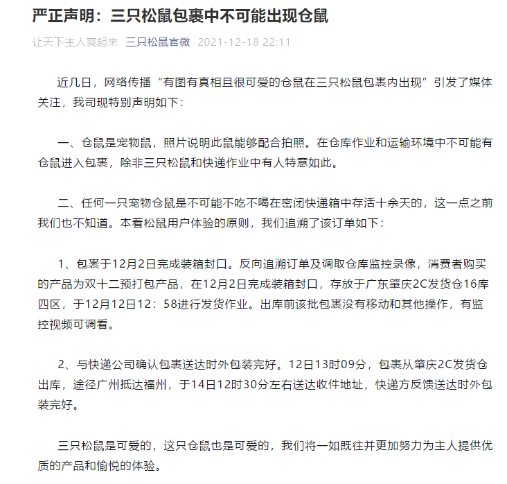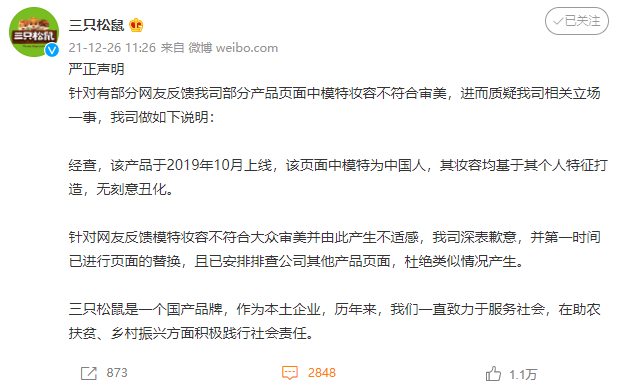 周末,三只松鼠登上了微博热搜! 事件的起因,是有网友晒出三只松鼠两年前上线的产品宣传海报,认为海报中模特的“眯眯眼”、厚嘴唇等元素,是在故意丑化国人,并将此次三只松鼠事件与此前引发众怒的陈漫事件相关联。随后,越来越多的网友加入讨论,#三只松鼠模特#这一话题也迅速登上微博热搜。 ![]() 对于该事件,三只松鼠回应券商中国记者称,该广告宣传页面于2019年10月上线,时值国潮风流行,因此选择“国潮风”来进行广告拍摄,意图传达给消费者国潮的视觉感受。该页面中模特为中国人,其妆容均基于其个人特征打造,绝无刻意丑化之意,与陈漫事件无关。此前,该广告宣传页面未接到任何投诉及反映。 ![]() 同时,三只松鼠官方微博也发文称,针对网友反馈模特妆容不符合大众审美并由此产生不适感,三只松鼠深表歉意,并第一时间已进行页面的替换,且已安排排查公司其他产品页面,杜绝类似情况产生。 模特妆容引发争议,三只松鼠登上微博热搜 日前,有网友晒出三只松鼠2019年10月份的产品宣传海报,因海报中模特的“眯眯眼”、厚嘴唇等元素,部分网友认为三只松鼠在故意丑化国人,此事在微博上引发争议。 ![]() 不过,也有网友表示,“不反感啊,是不是都得大眼睛才是主流审美啊!”还有网友评论称,“她就是这个眼睛,平时也接一接平面广告,没觉得有审美不妥,这下好了,天降大锅。” 此外,还有网友拿三只松鼠事件与此前引发众怒的陈漫事件相关联。今年11月份,在上海展出的《迪奥与艺术》展览中,一张由中国摄影师陈漫9年前拍摄的照片,引发质疑。 照片中,一位亚裔女性拿着迪奥经典款戴妃包,乌黑的眼影,暗沉带有雀斑的脸色,油腻的头发,还戴着清朝护甲……网友怒批“太阴间”“丑化亚裔”。 随后,陈漫在微博发文道歉称,其早期艺术观尚未成型,参加展览时对策展概念也不甚了解,使得当时的作品欠缺思考。她表示,自己感到非常自责并再次郑重道歉,现在已经深刻意识到,任何时候都不能忽略创作的严肃性和视角的全面性。“我已下架各平台相关内容,避免再次给大家带来伤害,同时也将多加钻研相关的历史,多参加相关的组织活动,加强自己的思想意识。” 陈漫说。 紧接着,迪奥也发文回应称, 陈漫女士的摄影作品《骄傲的矜持》是其参与的迪奥艺术项目作品之一,并非迪奥商业广告。当网络舆论出现对陈漫作品的意见时,迪奥立即予以高度重视,随即删除该作品在迪奥官方线上及线下的相关内容。 有网友发文点评三只松鼠相关事件称,“不为三只松鼠洗地,单纯说清楚几个点。这是三年前的旧账被翻了出来,酸辣粉国潮海报实际在2019年拍摄制作公布的,那时候国内基本都在跟风国潮,在经过陈漫事件后才被扒出来,其用意已经很明显。真实的模特本人就是第四张,有没有刻意化成眯眯眼,也很容易判断。” ![]() 三只松鼠回应:妆容基于个人特征打造,无刻意丑化 针对上述事件,三只松鼠回应券商中国记者称,该广告宣传页面于2019年10月上线,时值国潮风流行,因此选择“国潮风”来进行广告拍摄,意图传达给消费者国潮的视觉感受。该页面中模特为中国人,其妆容均基于其个人特征打造,绝无刻意丑化之意,与陈漫事件无关。此前,该广告宣传页面未接到任何投诉及反映。 同时,当日午间,三只松鼠官方微博也发文称,针对网友反馈模特妆容不符合大众审美并由此产生不适感,三只松鼠深表歉意,并第一时间已进行页面的替换,且已安排排查公司其他产品页面,杜绝类似情况产生。 ![]() 三只松鼠发布严正声明称,针对有部分网友反馈公司部分产品页面中模特妆容不符合审美,进而质疑公司相关立场一事,公司做如下说明: 经查,该产品于2019年10月上线,该页面中模特为中国人,其妆容均基于其个人特征打造,无刻意丑化。 针对网友反馈模特妆容不符合大众审美并由此产生不适感,我司深表歉意,并第一时间已进行页面的替换,且已安排排查公司其他产品页面,杜绝类似情况产生。 三只松鼠是一个国产品牌,作为本土企业,历年来,我们一直致力于服务社会,在助农扶贫、乡村振兴方面积极践行社会责任。 前三季度净利同比增67%,最新市值为161亿元 公开资料显示,三只松鼠是一家全渠道经营、全品类覆盖以休闲食品为核心的多品牌公司,向消费者提供休闲食品与服务。包含以“聚焦坚果+精选零食”的主品牌“三只松鼠”、聚焦宝宝零食的新品牌“小鹿蓝蓝”。 2021年前三季度,三只松鼠营收为70.70亿,同比下降2.23%;归属于母公司的净利润为4.42亿,同比增长67.35%。 前三季度,小鹿蓝蓝实现全渠道营收3.32亿元,2020年6月19日上线至今,营收规模持续增长,连续13个月稳居全网宝宝零食类目第一,市占率超第二、三名之和。营收高速增长的同时,小鹿蓝蓝推广费率持续优化,投入产出比逐季提升,并在第三季度实现亏损大幅收窄。 去年下半年以来,线上传统电商渠道流量增长乏力、主动调减SKU、减少广告投放,公司收入持续收缩。不过中信证券(26.000, 0.31, 1.21%)11月初发布的研究报告认为,公司收入有望从第四季度开始转正,重新回到收入和利润双增的成长阶段,主要是因为:1)公司SKU调减到位;2)公司开始加速发力线下分销渠道;3)公司产品回归坚果,持续将资源投入到坚果产品的研发、推广,今年年货节公司将重点推广坚果礼品装。 三只松鼠于2019年7月12日在深交所创业板上市,上市