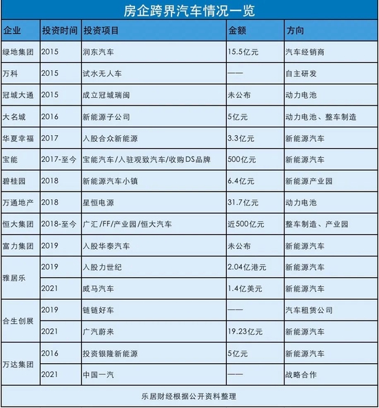 在股权上,万达汽车科技服务由大连万达集团股份有限公司、泰庆(北京)科技有限公司,各持股65%和35%。 二股东泰庆科技也是一家汽车渠道公司,于去年10月新成立,注册资本5000万元,岳曰安、鲍伟杰和成晓莹分别持股80%、10%和10%。 值得注意的是,岳曰安也出现在去年8月万达与一汽的签约仪式现场,他是山东泰岳集团董事长和实控人,而泰岳集团的另外一重身份是被一汽红旗认定的全国最大的战略合作经销商——“泰岳宏旗”的大股东。 可见,王健林跨界汽车行业,不仅仅提供场地来供红旗车型展示,而是找到了有汽车销售背景的专业玩家进行合作,希望在汽车销售方面拥有更大的话语权。 曲线投资可“吃肉” 把“造车”这个专业且投入大的事情交给车企来做,万达来做轻资产运营,就再轻松也合适不过了。这种“互补式投资”的做法,也并非只有万达一家想到,例如融创、雅居乐、合生创展等房企也都在尝试类似路径。 2021年初,有“合生系”背书的珠投智能作为战略投资者,向广汽蔚来(现称“合创汽车”)增资19.23亿元,凭此拿下广汽蔚来超66%股权,正式进军新能源汽车领域。 实际上,朱孟依的汽车梦最早显露于2019年7月,合生创展旗下汽车租赁公司链链好车携广汽新能源及驭道天下,共同举办了战略合作签约仪式。当时,合生创展称将计划投入100亿元在新能源汽车共享领域。 与朱孟依“跨界观”不谋而合,孙宏斌也选择不直接造车,而是投资新能源汽车相关产业。去年7月,”融创系”公司天津润泽物业管理和天津标的怡恒企业管理,分别持股成都特隆美储能技术15.34%、10.23%股份,共计出资2.5亿元。 据乐居财经获悉,特隆美公司是一家储能系统供应商,经营范围包括电池制造、新能源原动设备制造、新能源汽车整车销售等。 任由外界怎么鼓吹“造车”神话,老孙对于造车一直都保持理智。早些年间,融创投资乐视150亿元,他也没有涉及汽车板块。彼时,在孙宏斌看来,“看好乐视汽车,但汽车板块更难理解,没来得及看,以后再看。” 转眼至去年底,雅居乐于11月30日公告称,斥资1.4亿美元投资威马汽车4.22%股权。实际上早在2020年,威马汽车100亿元D轮融资名单,雅居乐就位列其中。此外,2019年,雅居乐还斥资2.04亿港元向力世纪认购合共4亿股新股份。 像雅居乐、合生这般选择投资潜力车企,不参与经营和管理,强调的是股权层面的财务投资,这种路径更加安全,更容易成功,资金压力也远低于亲自造车。 如若押注的车企真能顺利上市,可分一杯羹,赚到的钱比兢兢业业盖房子卖房子来钱更快。 以上几家房企都是“互补式投资”汽车领域的典型代表。但有所不同的是,万达牵手一汽,侧重于“业务型投资”,王健林目前并没有砸入真金白银去入股一汽,仅仅是在原有的商超体系去为车企打造新的购车用车服务。 亲自“造车者” 抢夺汽车红利,房企玩法各不同。有的地产大佬热衷于财务投资,有的老板却偏偏喜欢自己下场造车,尝尝汽车行业的“速度与激情”。但往往结果不尽如人意,还把自己“玩死”了。 “下半辈子就干汽车了”,这是姚振华在高层会议上的讲话。从“宝万之争”中抽身后,姚老板决心投身造车事业,于2017年成立宝能汽车,紧接着以共计81.9亿元分两次收购了观致汽车63%的股份,2019年又收购长安PSA旗下DS品牌。 宝能在造车上到底花了多少钱? 去年9月,姚振华揭晓了谜底,“宝能自2016年进入汽车行业以来,已经投入超过500亿元。”他的终极flag是要力争通过10-15年,打造具备强大竞争力和国际影响力的全球一流新能源汽车企业集团。 姚振华之所以大笔撒钱、亲自下场造车,其好处之一就是可以解决拿地难、拿地价格高的问题。在全国鼓励新能源汽车产业发展的大背景下,各地方政府均明确对新能源汽车产业加大政策支持力度,尤其是建设用地的支持。 这几年,宝能借由造车基地的风口在各地拿下不少土地项目。据统计,宝能旗下造车基地及项目占地约9000亩。但眼下,随着宝能陷入资金链危机,DS品牌和观致汽车的命途也急转直下。 相关数据显示,DS品牌2021年前7月销量仅为650辆,处于岌岌可危的境况之下;观致汽车被收购后,经宝能“左手倒右手”的招数,2018年销量暴涨320%,此后便疲态尽显。根据中国汽车工业协会数据,2021年上半年,观致汽车仅售出3987辆汽车。 看好新能源汽车的,显然不只宝能一家。恒大许家印则在2019年初与“为梦想窒息”的贾会计闹掰后,转而自己造车。 许老板遵守“五句箴言”——买买买、合合合、圈圈圈、大大大、好好好,为整合造车资源,2019年,恒大以9.3亿美元收购汽车公司NEVS 51%的股权,此后又在一年内相继收购、投资了多家汽车产业链上下游企业。 2021年4月,上海车展上,恒大汽车终于带来了9款 1:1汽车模型,并许诺将于2021年四季度全面启动生产,2022年开启大规模交付。 然而,约定的四季度都过去了,恒大至今没有一辆车上市和出售。同时恒大汽车也深陷困局,因为母公司暴雷,它的部分股权也被摆上了“货架”。 走投无路之下,许家印宣布在10年内实现恒大由房地产业向新能源汽车产业的转型。 如若恒大能脱胎换骨,彻底成为一家新能源汽车为主的公司,将成为首家从卖房到卖车转型的房企。但是,从目前恒大深陷2万亿债务泥潭的情况看,这一转型成功的几率微乎其微。 开发商有资金,这是其造车的优势。然而,与地产相比,汽车产业的回