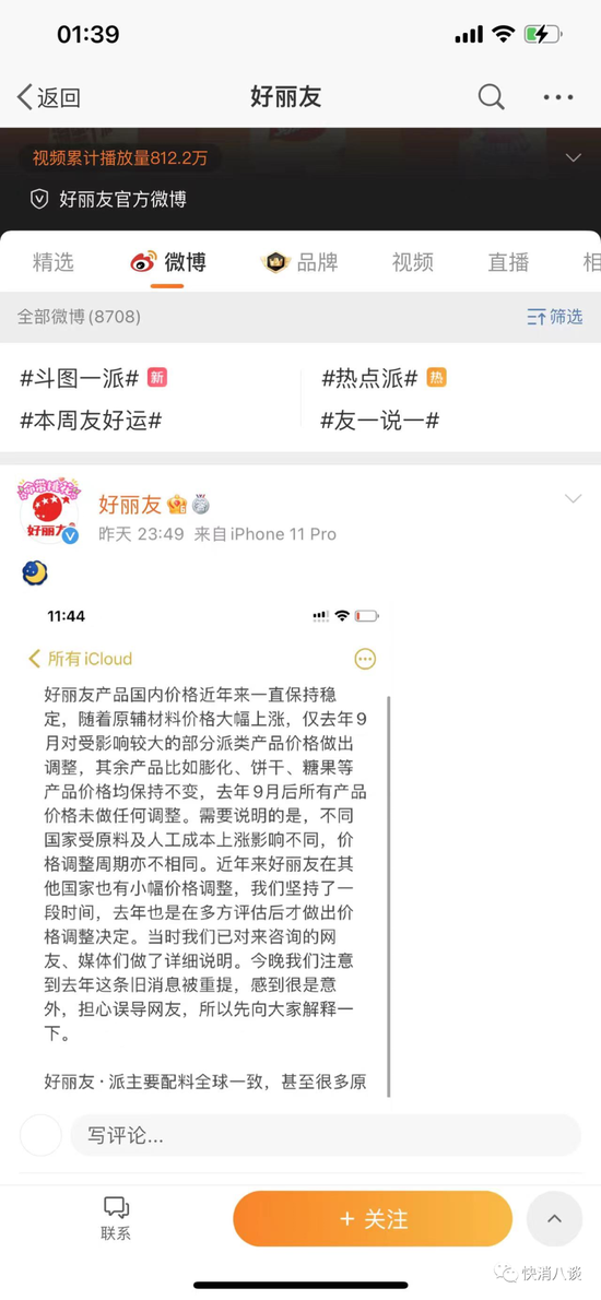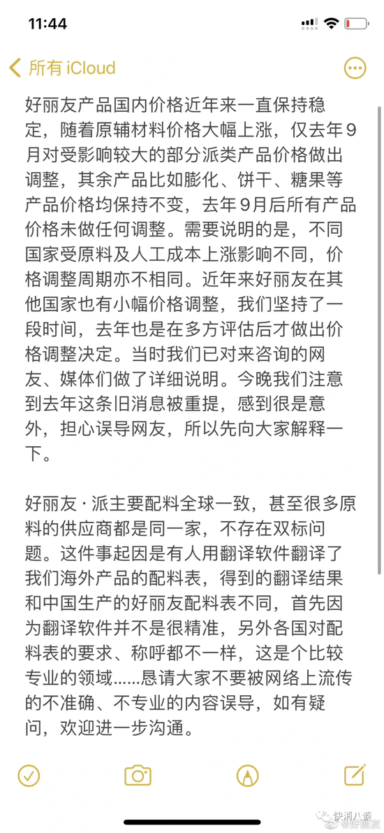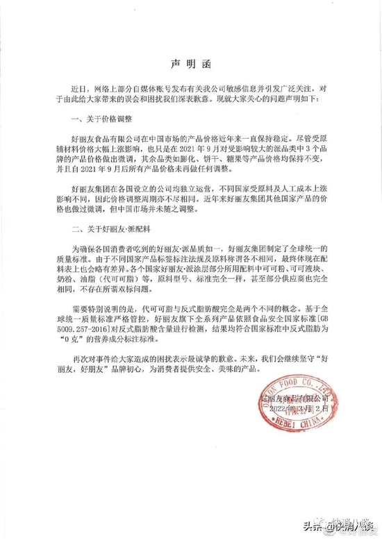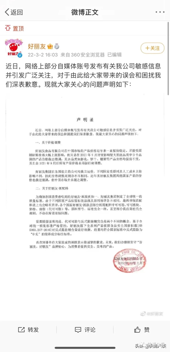 3月1日深夜,好丽友涨价相关话题登上微博热搜第一。 ![]() 有消息称:“近期韩国品牌好丽友icon宣布仅在俄罗斯与中国对其产品进行涨价,其他国家不涨价,以抵消其原材料上涨成本!好丽友的巧克力派在世界上占领70%的市场份额,中国市场为其赚到大笔资金,确反过来反噬中国。另外其配料双标,在国外生产的好丽友使用可可粉icon,而在中国生产销售的是代可可脂配料!损害中国人身体健康!希望大家认准国产品牌!抵制不良品牌!”图中有网友称:“好丽友是代可可脂,根本不是天然可可,是工业生产的可可脂,吃一块,人体非常难吸收跟排出。” ![]() 随后,好丽友官方通过微博发布消息:“好丽友产品国内价格近年来一直保持稳定,随着原辅材料价格大幅上涨,仅去年9月对受影响较大的部分派类产品价格做出调整,其余产品比如膨化、饼干、糖果等产品价格均保持不变,去年9月后所有产品价格未做任何调整。需要说明的是,不同国家受原料及人工成本上涨影响不同,价格调整周期亦不相同。近年来好丽友在其他国家也有小幅价格调整,我们坚持了一段时间,去年也是在多方评估后才做出价格调整决定。当时我们已对来咨询的网友、媒体们做了详细说明。今晚我们注意到去年这条旧消息被重提,感到很是意外,担心误导网友,所以先向大家解释一下。” ![]() 2021年8月25日,好丽友相关负责人曾向北京商报记者证实,近年来原材料、包装物料及人工成本不断上涨。公司经研究决定自2021年9月1日起,对旗下派品类部分产品进行价格调整,其他产品如饼干、膨化、糖果等系列价格保持不变。据悉,4款派类产品在中国市场的售价将上调约6-10个百分点,其中包括“巧克力派”“Q蒂”等产品。 ![]() 小八查询发现,在2021年8月的报道中提到,好丽友食品天猫旗舰店中出售的30枚装的巧克力派售价为33.9元。3月2日,小八查询发现,在该店铺出售的同规格巧克力派为34.9元。由此可见,该产品已涨价1元。 ![]() 针对上述消息质疑的关于好丽友产品配料一事,好丽友在微博中说明道:“好丽友·派主要配料全球一致,甚至很多原料的供应商都是同一家,不存在双标问题。这件事起因是有人用翻译软件翻译了我们海外产品的配料表,得到的翻译结果和中国生产的好丽友配料表不同,首先因为翻译软件并不是很精准,另外各国对配料表的要求、称呼都不一样,这是个比较专业的领域……恳请大家不要被网络上流传的不准确、不专业的内容误导,如有疑问,欢迎进一步沟通。” 小八查询好丽友天猫旗舰店看到,在好丽友·派的配料表中,除了使用可可粉、可可液块等,也明确标明了含有代可可脂。对此,小八咨询了好丽友客服,但由于客服未在工作时间内,对此尚未予以回复。 ![]() 除了上述消息,让网友们更为惊讶的是,好丽友此次微博发布使用的是手机备忘录截图。截至发稿,评论区热度最高的一条是“公司说明用备忘录?????可真有你的”。此外,还有多位网友在评论区:“以后不会再买好丽友了。” ![]() 3月2日,针对近日网络上部分自媒体账号发布有关好丽友涨价与原料“双标”等问题,好丽友通过官方微博再次发布正式声明称:“好丽友食品有限公司在中国市场的产品价格近年来一直保持稳定。尽管受原辅材料价格大幅上涨影响,也只是在2021年9月对受影响较大的派品类中3个品牌的产品价格做出微调,其余品类如膨化、饼干、糖果等产品价格均保持不变,并且自2021年9月后所有产品价格未再做任何调整。好丽友集团在各国设立的公司均独立运营,不同国家受原料及人工成本上涨影响不同,因此价格调整周期亦不尽相同。近年来好丽友集团其他国家产品的价格也做过微调,但中国市场并未随之调整。” ![]() 关于好丽友·派配料“双标”问题,好丽友方面在声明中表示:“为确保各国消费者吃到的好丽友·派品质如一,好丽友集团制定了全球统一的质量标准。由于不同国家产品标签标注法规及原料称谓各不相同,最终体现在配料表上也会略有差异。各个国家好丽友·派涂层部分所用配料中可可粉、可可液块、奶粉、油脂(代可可脂)等,原料型号、标准完全一样,甚至部分供应商也完全相同,不存在所谓双标问题。需要特别说明的是,代可可脂与反式脂肪酸完全是两个不同的概念。基于全球统一质量标准严格管控,好丽友旗下全系列产品依照食品安全国家标准[GB5009.257-2016]对反式脂肪酸含量进行检测,结果均符合国家标准中反式脂肪为“0克”的营养成分标注标准。” ![]() 资料显示,好丽友集团成立于1956年,与乐天、农心和CJ(希杰)同属韩国四大食品公司。1995年,好丽友进入中国市场,1997年河北廊坊工厂第一条生产线建成投产。进入中国市场以来,好丽友陆续推出了好丽友·派、呀!土豆、薯愿、好友趣、好多鱼等近30款产品。 数据显示,2016年,好丽友在中国收入达77.18亿元。2017年的收入跌落至51.55亿元。2018年,好丽友中国业绩恢复增长,收入为56.07亿元。2019年,好丽友在中国销售约56.58亿元,但收入增幅不到1%,远低于2018年的18%。2020年好丽友中国销售约70亿元,虽然整体业绩有所上涨,但相比2016年77亿元仍有较大差距。 那么问题来了! 你还会买好丽友吗? |