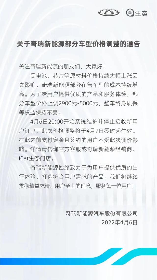新能源车涨价潮仍在继续。 4月6日晚间,极狐汽车于官方微信公众号平台发布公告称,受到上游原材料价格上涨、国补退坡等因素的影响,决定2022年5月1日起,对极狐品牌所有车型进行一定的价格调整,具体调整方案将在2022年4月30日前公布。 奇瑞新能源也于6日晚间在官方微信公众号平台发布了涨价公告称,受电池、芯片等原材料价格持续大幅上涨因素影响,奇瑞新能源部分在售车型的成本持续增高,将对部分车型价格上调2900元-5000元,此次价格调整将于4月7日零时起生效。 ![]() 一周之内又6家车企官宣涨价 包括清明小长假在内的一周之中,已有多达6家新能源车企宣布涨价。 4月2日,极氪汽车发布公告称将于5月1日起涨价,具体涨价方案将于4月30日前公布。极氪方面称,“近期受上游原材料价格持续上涨等因素影响,新能源汽车价格上调成为行业普遍现象。极氪也收到了用户关于权益及价格调整的问询。充分考虑用户利益后,我们决定:2022年3-4月限时购车权益不变,4月极氪001价格不调整;2022年5月1日零时起,极氪001售价进行上调,权益及价格调整方案将于2022年4月30日前公布。” 仅3月31日,就有3家车企发布涨价通知。 上汽荣威公告称,受原材料价格持续大幅上涨的影响,上汽荣威汽车将对旗下荣威i6MAXEV部分车型和荣威Ei5车型的官方指导价进行调整,上调幅度为3000元-5000元。此次价格调整将从5月1日零时起正式生效。 东风岚图表示受芯片短缺、上游原材料大幅涨价等因素影响,决定自5月1日起,对岚图FREE纯电车型售价上调1万元,增程式车型售价暂不调整。 长安新能源也发布了关于车型价格调整的说明,表示受上游原材料价格上涨等因素影响,对旗下车型奔奔E-Star国民版多彩款价格进行调整,4月1日起该款车型官方指导价上调4000元。 在缺芯、原材料价格持续上涨、国补退坡等的多重因素的压力下,今年以来,多数较为主流的新能源车企都先后发布过涨价通知,其中更不乏如特斯拉、小鹏、上汽荣威等进行过多轮涨价者。据澎湃新闻统计,仅3月份就已有包括长城欧拉、上汽荣威、广汽埃安、特斯拉、五菱、比亚迪(240.000, -1.90, -0.79%)、奇瑞新能源、小鹏、哪吒、吉利几何、零跑、威马、蔚来、理想、创维、爱驰、东风岚图、长安新能源等近20家车企官宣涨价。 提价背后仍是原材料价格暴涨和缺芯 本轮新能源车涨价的最主要原因依旧是原材料价格暴涨与缺芯。在前述车企的涨价公告中,无一例外提及了芯片短缺、上游原材料涨价等推动因素。 3月19日,理想汽车CEO李想发布微博称,本轮新能源车涨价主要是由于“电池成本上涨的幅度非常离谱”。他表示,“目前来看,和电池厂商已经合同确定了二季度电池涨价幅度的品牌,基本上就都立刻宣布了涨价。还没有涨价的,大部分是涨价幅度还没有谈妥的,待谈妥后也普遍会立刻涨价。二季度电池成本上涨的幅度非常离谱。战争、政治、疫情让买车还能升值,美国二手车价格整体上涨了30%。” 3月26日,在宣布对改款车型提价时,蔚来汽车方面也表达了成本上涨带来的压力,“近期电动车企业纷纷涨价,原因是以电池为主的国际原材料价格戏剧性上涨,再加上芯片供应短缺,整个供应链成本明显增加。” 在3月26日举办的第八届中国电动汽车百人会论坛上,小鹏汽车CEO何小鹏在接受采访时直言,动力电池供应紧张仍将是今年中国车企不小的挑战,就小鹏汽车目前与供应商沟通情况来看,动力电池涨价比例“超出想象”。 何小鹏预测,电池的供应紧张可能会在明年的第二、第三季度才有所缓解。同时他还表示,期待在今年的第三季度,原材料可以停止上涨,甚至可能实现稳中有降。 乘联会秘书长崔东树日前发表发文提到,今年以来,原材料涨价导致动力电池价格上涨的速度大大出乎业内预期。部分电池企业改变了价格谈判规则,价格每季度谈定、并有价格开口,因此部分车企压力非常大,只能通过涨价来缓解成本压力。同时,他表示,新能源汽车的价格上涨或在一定程度上抑制市场需求。 |