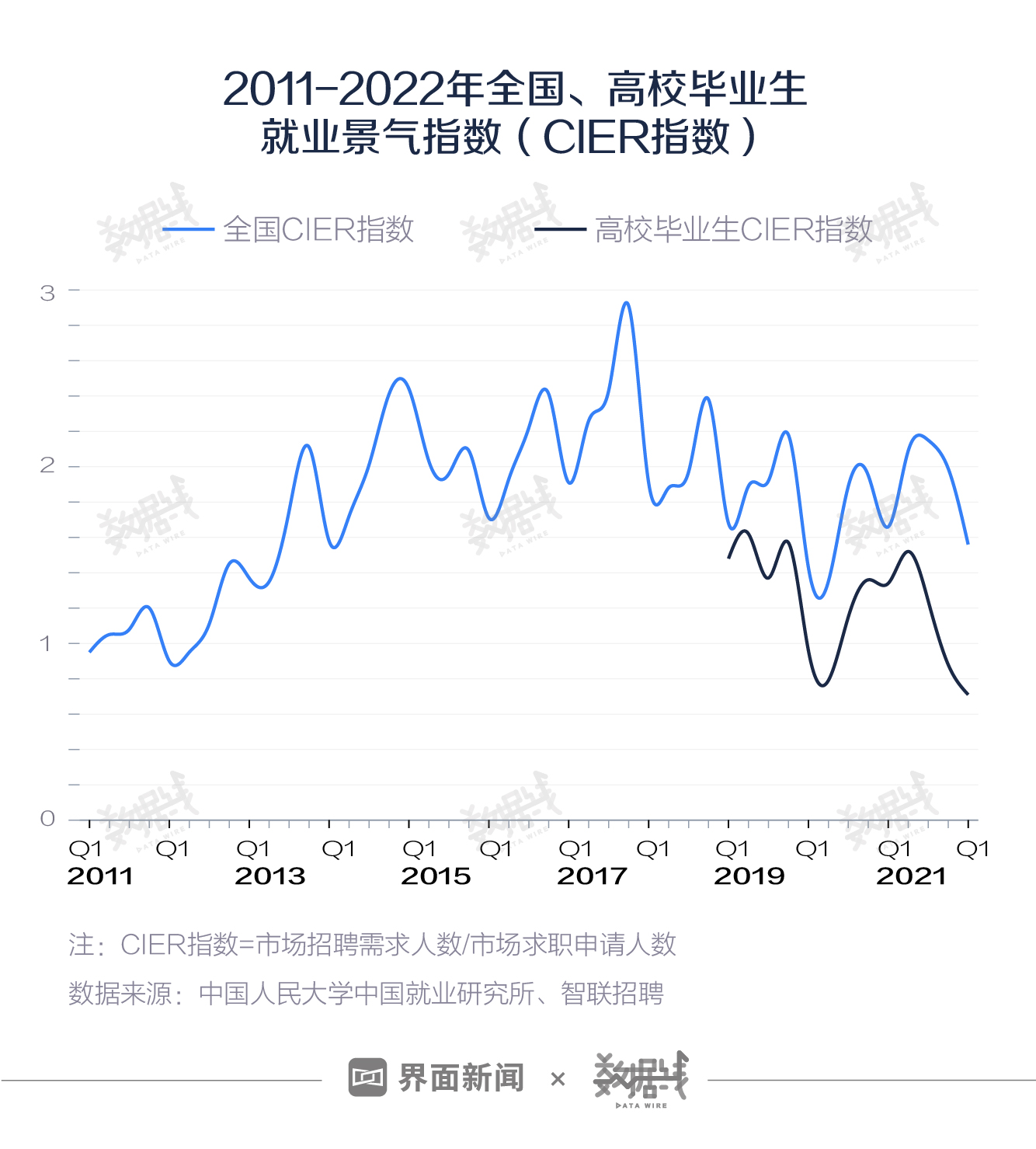 2022年的春招市场迎来了疫情以来最激烈的竞争,对于应届毕业生来说,今年找工作比过去两年还要困难。 近4年应届生“最难就业季” 今年毕业生找工作不仅比疫情前的2019年要难,也比疫情以来的两年难度还大。据中国人民大学中国就业研究所与智联招聘联合发布的报告,今年一季度,高校毕业生CIER指数(就业市场景气指数)为0.71,创下自2019年有数据以来的最低值。 不止毕业生,今年所有人找工作都很难。2022年一季度全国CIER指数为1.56,处于近9年同期的较低水平,只比2020年疫情初期高一些。 ![]() 另据国家统计局数据,2022年3月,全国16-24岁人口城镇调查失业率为16%。对比同期数据来看,青年失业率已经达到近5年同期最高值。 ![]() 为什么这么难? 从供给端来看,今年是史上毕业生最多的一年。据教育部预计,2022年高校毕业生规模首次突破千万,为1076万人,同比增速18.4%,达到近15年来最快的增长速度。 ![]() 线上找工作的人数也达到疫情以来的新高峰。据《2022年春季求职招聘市场洞察报告》,2022年2月在线求职平台月活跃用户数大幅上涨至1.28亿,渗透率增加到12.1%。 ![]() 从需求端来看,今年春招市场上招聘需求涨得不多。据智联招聘数据,春节后首月,招聘市场总体需求同比小幅上涨1.1%。不同规模的企业招聘需求也有差异。大型企业春节后首月招聘需求保持增长,万人以上企业招聘职位数同比增长超两成。中小企业春节后首月招聘需求减少,规模在500-999人的企业招聘职位数同比下降最多,降幅为11.6%。 ![]() 今年春招市场的竞争是疫情以来最激烈的。2022年春节后首月的竞争指数明显高于过去两年。从平均值来看,今年春节后首月的就业市场竞争指数为15.6,分别相当于2020年、2021年同期的1.5倍、1.6倍。 ![]() 找工作太“卷”,考研也不容易 就业压力下,选择考研的人越来越多。据教育部,2022年全国硕士研究生招生考试报考人数达457万人,同比增速超两成。2016年至今,考研报名人数已经同比“7连涨”。其中,从2017年开始,考研报名人数同比增速始终保持在10%以上。 ![]() |
