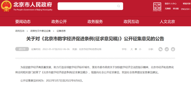 数字经济增加值全国领先的北京,将再度通过制度创新来创造发展新动能。 5月7日,北京市经济和信息化局会同相关部门发布《北京市数字经济促进条例(征求意见稿)》(下称《条例》),并公开征求意见。 《条例》指出2021年,北京数字经济增加值达到1.6万亿元,同比增长13.1%,占GDP比重为40.4%;数字经济核心产业增加值8918.1亿元,同比增长16.4%,占GDP比重达22.1%,北京在推动数字经济发展过程中形成了很多创新实践,也存在一定的瓶颈制约,亟需制定一部数字经济领域的综合性地方法规,通过制度创新为数字经济发展注入强劲动力。 《条例》共九章五十八条,分别从数字基础设施、数据资源、数字产业化、产业数字化、数字化治理、数字经济安全和保障措施等方面对北京市的数字经济工作进行法规制度设计。 其中,《条例》不仅对数字经济所涉及的各类企业、市场主体提出了支持举措,还通过优化过的制度建设来促进数字经济创新发展,比如支持社会资本平等参与数字基建,推动数据生产要素资本化核算,鼓励平台企业参与建设等。 ![]() (截图来源:北京市人民政府官网) 来看《条例》重点内容: 1、除法律、行政法规另有规定外,数字基础设施建设可以采取政府投资、政企合作、特许经营等多种方式。符合条件的各类市场主体和社会资本,可以平等参与投资、建设和运营。 2、信息网络基础设施运营企业应当平等进入,不得垄断经营,用户有权自主选择电信业务经营企业。 3、北京将探索建立数据生产要素会计核算制度,推动数据生产要素资本化核算,激发企业在数字经济领域投资动力。 4、鼓励本市公共机构实施的数据采购活动,依托国际大数据交易所实施。鼓励其他市场主体通过国际大数据交易所进行入场交易。 5、积极支持平台企业规范健康发展,鼓励其利用互联网的优势,赋能经济社会转型升级,加大创新研发投入,提升国际竞争力,优化平台发展生态,加强平台企业间、平台企业与中小企业间的合作共享,促进数字技术与实体经济融合发展。 6、鼓励共享经济业态创新,支持远程办公等在线服务和产品的优化升级。允许个人利用电子商务、社交软件、知识分享、音视频网站、创客等新型平台就业创业,有序引导新个体经济。 7、支持开展自动驾驶全场景运营,培育推广智能网联、智能公交、无人配送机器人(7.500, -0.16, -2.09%)、智能停车、智能车辆维护等新业态。 8、支持互联网医院发展,鼓励提供在线问诊、远程会诊、机器人手术、智慧药房等新型医疗服务。 9、运用财政性资金和各类产业基金,加大对数字经济关键核心技术研发、重大创新载体平台建设、应用示范和产业化发展等方面的资金支持力度,引导和支持社会力量加大资金投入。 10、积极开展数字经济领域的国际合作,积极参与制定国际规则和协议,搭建国际会展、商贸、赛事、培训等合作平台。 看点一:各类市场主体和社会资本平等参与数字基础设施建设 《条例》明确,北京将加快建设信息网络基础设施、算力基础设施和新技术基础设施,推进传统基础设施的数字化改造,推动城市数字化由数字孪生到数字原生。有关部门应当将数字基础设施建设纳入本行政区域经济社会发展规划和国土空间规划,相关部门在能源、土地、市政、交通等方面给予保障。 《条例》还要求,除法律、行政法规另有规定外,数字基础设施建设可以采取政府投资、政企合作、特许经营等多种方式。符合条件的各类市场主体和社会资本,可以平等参与投资、建设和运营。 根据《条例》部署,北京市将推进四类数字基础设施建设: 1、支持建设新一代高速固定宽带和移动通信网络、卫星互联网、量子通信等网络基础设施,统筹推进骨干网、核心网、专用网和基站建设。 2、推动建设感知物联网,支持部署低成本、低功耗、高精度、高可靠的智能化传感器,提高在工业制造、农业生产、公共服务、应急管理等领域的物联网覆盖水平。支持建设车路协同基础设施,推进道路基础设施、交通标志标识的数字化改造和建设。 3、建设城市智能计算集群,强化算力统筹、智能调度和多样化供给,提升面向特定场景的边缘计算能力,促进数据、算力、算法和开发平台一体化的生态融合发展,协同周边城市共建全国一体化算力网络京津冀国家枢纽节点。 4、推进人工智能、区块链、大数据、隐私计算、城市空间操作系统等新技术基础设施建设,支持建设通用算法、底层技术、软硬件开源等共性平台。 《条例》同时明确,信息网络基础设施运营企业应当平等进入,不得垄断经营,用户有权自主选择电信业务经营企业。 看点二:鼓励市场主体通过北数所入场交易 《条例》提出,北京将探索建立数据生产要素会计核算制度,推动数据生产要素资本化核算,激发企业在数字经济领域投资动力。推进建立数据资产的登记和评估制度,支持开展数据入股、数据信贷、数据信托和数据资产证券化等数字经济业态创新,培育发展交易撮合、评估评价、中介经纪、托管运营、合规审计、争议仲裁等数据服务市场。 实际上,为推动数据要素市场化配置和数字经济高质量发展,北京已在去年3月31日正式成立北京国际大数据交易所(下称“北数所”),并上线北京数据交易系统。 据北数所去年的发展成果介绍,中科院大气所、中国人民公安大学网空基地、北京互联网法