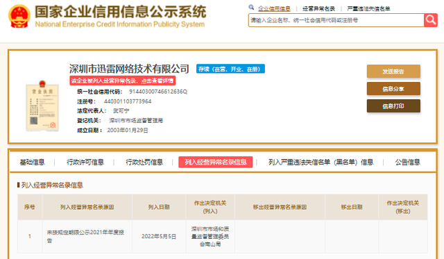 5月9日消息,《财经天下》周刊日前通过国家企业信用信息公示系统了解到,深圳市迅雷网络技术有限公司(简称“迅雷公司”)因未按规定期限公示2021年年度报告被列入经营异常公司名录,决定机关为深圳市市场和质量监督管理委员会南山局。 ![]() 公开资料显示,迅雷公司(纳斯达克股票代码:XNET)成立于2003年,是全球领先的共享计算与区块链技术创新企业,同时也是中国用户数领先,历史悠久的互联网品牌之一。 迅雷此前发布财报显示,2021年,公司实现收入2.4亿美元,同比增长28.3%,基于非美国通用会计准则的净利润728万美元,该数据在2020年是净亏损1183万美元。 根据财报披露,2021年迅雷云计算和其他互联网增值服务收入1.36亿美元,较上年增长52.7%;订阅收入9120万美元,较上年增长8.2%;在线广告收入1230万美元,较上年减少7.1%。(文|《财经天下》周刊 唐果) |