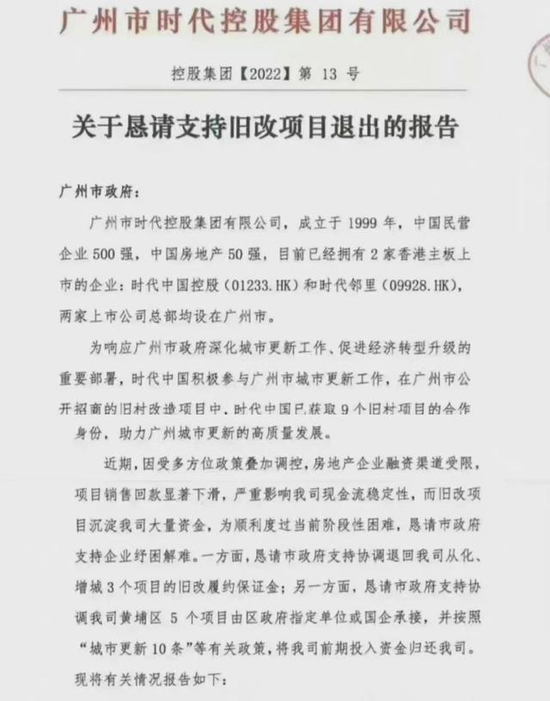 地产 | “旧改王”时代中国“求救”,欲退出多个旧改项目纾解资金压力? 素有“旧改王”之称的广州市时代控股集团有限公司(下称“时代中国”),近期因恳请政府协调退还旧改项目投入的20.1亿元资金而备受关注。 2022年4月初,一份时代中国《关于恳请支持旧改项目退出的报告》(下称《报告》)流出。该报告加盖了公司印章,落款时间为2022年3月29日。《商学院》记者根据报告中所留有的联系方式,拨通联系人的电话,得到《报告》内容属实的回复。 ![]() 延宕十余年,积极布局旧改项目的时代中国,现如今对旧改项目态度为何转变?未来还会继续做旧改项目吗?退出旧改项目对公司的战略目标和规划产生怎样的影响? 对此,时代中国对《商学院》记者表示,“当城市更新政策和市场环境发生变化和调整时,我司会因应变化定期对存量城市更新项目进行审视及调整。针对近期广州市及下属各区城市更新政策及计划的修正及变动,我司积极与政府相关部门就个别项目事宜沟通新的推进解决方案,是正常的企业经营行为。城市更新是我司的核心业务之一,目前我司在国内各地的城市更新项目均在稳步有序推进当中。” 退出多个旧改项目 《商学院》记者在《报告》中发现,时代中国要求退出的三个项目均位于广州。 《报告》提出,此前为响应广州市政府深化城市更新工作、促进经济转型升级的重要部署,时代中国积极参与广州城市更新工作,在广州市公开招商的旧村改造项目中,时代中国已获取9个旧村项目的合作身份,并注入大量资金。近期,因房地产企业融资渠道受限,项目销售回款显著下降,严重影响我司现金流稳定性,而旧改项目沉淀我司大量资金,为顺利度过当前阶段性困难,时代中国恳请政府支持协调退回公司从化、增城3个项目的旧改履约保证金,协调公司黄埔区5个项目由区政府指定单位或国企承接,并归还我司前期投入资金。 据《报告》称,时代中国分别在2019年3月、2020年7月和2021年10月与从化区禾仓村、增城区城丰村和增城区新汤村签订项目合作协议,成为旧村改造项目的合作/意向企业。上述三个项目时代中国投入履约金合计3亿元。 另外,时代中国在黄埔区参与的五个旧村改造项目(岗贝村、双井村、乌石村、裕丰围村、重岗村)拆迁工作已经基本完成,并已支付了17.1亿元的拆迁补偿费用,累计投入17.1亿元。 据《报告》称,上述的8个项目,时代中国合计投入20.1亿元,但由于政策变化,项目无法正常推进。 时代中国在《报告》中提及的政策变化,系国家住建部于2021年8月30日下发了《关于在事实城市更新行动中防止大拆大建问题的通知》(简称“63号文件”)。 63号文件强调,有些地方出现继续沿用过度房地产化的开发建设方式、大拆大建、急功近利的倾向,随意拆除老建筑、搬迁居民、砍伐老树,变相抬高房价,增加生活成本,产生了新的城市问题。同时,为积极稳妥实施城市更新行动,住房和城乡建设部提出严防大拆大建。 随后,2021年10月20日,广州住建局发布关于对《广州市关于在实施城市更新行动中防止大拆大建问题的意见》公开征求意见(以下简称“《征求意见稿》”)公告。 该《征求意见稿》首先明确,系统推进城市更新,过往“跑马圈地式”的城市更新推进模式将有所暂缓。同时还提出,将在老城区范围内严格控制大规模拆除,严格控制大规模增建。城中村等城市连片旧区不短时间、大规模进行拆迁,合理确定更新模式。坚持应留尽留,不随意迁移、拆除不可移动文物、历史建筑和具有保护价值的老建筑,未开展历史文化资源调查评估、未完成历史文化街区划定和历史建筑确定工作的区域,不应实施城市更新。 一名接近旧改工作的人士表示,广州旧改备受关注的原因在于部分大龄古树在旧改过程中遭破坏。 早在2021年3月,广州黄埔区就曾表示对区域内大龄古树集中移植保护。基于此,部分对古树处置不力的企业还因此遭处罚。 2022年2月8日,广州黄埔区住建局公布了两则《行政处罚决定书》,内容为水西社区三旧改造项目施工过程中,导致涉案古树致死。因此,长岭街水西社区长龙经济合作社、广州市建润建材有限公司(下称“广州建润”)遭到行政处罚,罚款分别为25万元、8万元。时代中国虽未因前述原因遭处罚,但其此次提出退出的旧改区域大部分位于广州黄埔区。 克而瑞广佛区域首席分析师肖文晓认为,“2021年8月30日,住建部强调‘严防大拆大建’的63号文件发布后,让原本改造周期较为漫长的旧改慢上加慢,政策环境的变化也让部分企业猝不及防,因而心生退意。” 资金承压 不仅是政策方面的变化,时代中国在《报告》中指出:“近期,因房地产企业融资渠道受限,项目销售回款显著下降,严重影响我司现金流稳定性,而旧改项目沉淀我司大量资金,为顺利度过当前阶段性困难,时代中国恳请政府支持协调退回公司从化、增城3个项目的旧改履约保证金,协调公司黄埔区5个项目由区政府指定单位或国企承接,并归还我司前期投入资金。” 事实上,如今时代中国销售额已出现下滑。时代中国财报显示,2022年前4个月,时代中国累计合同销售(连合营项目销售)金额约为177.47亿元,签约建筑面积约为106.8万平方米,同比分别下降37.3%、26.7%。 诸葛找房数据研究中心分析师梁楠分析认为,“时代中国土地储备主要位于粤港澳大湾区城市,区域集中度较高,项目体量也