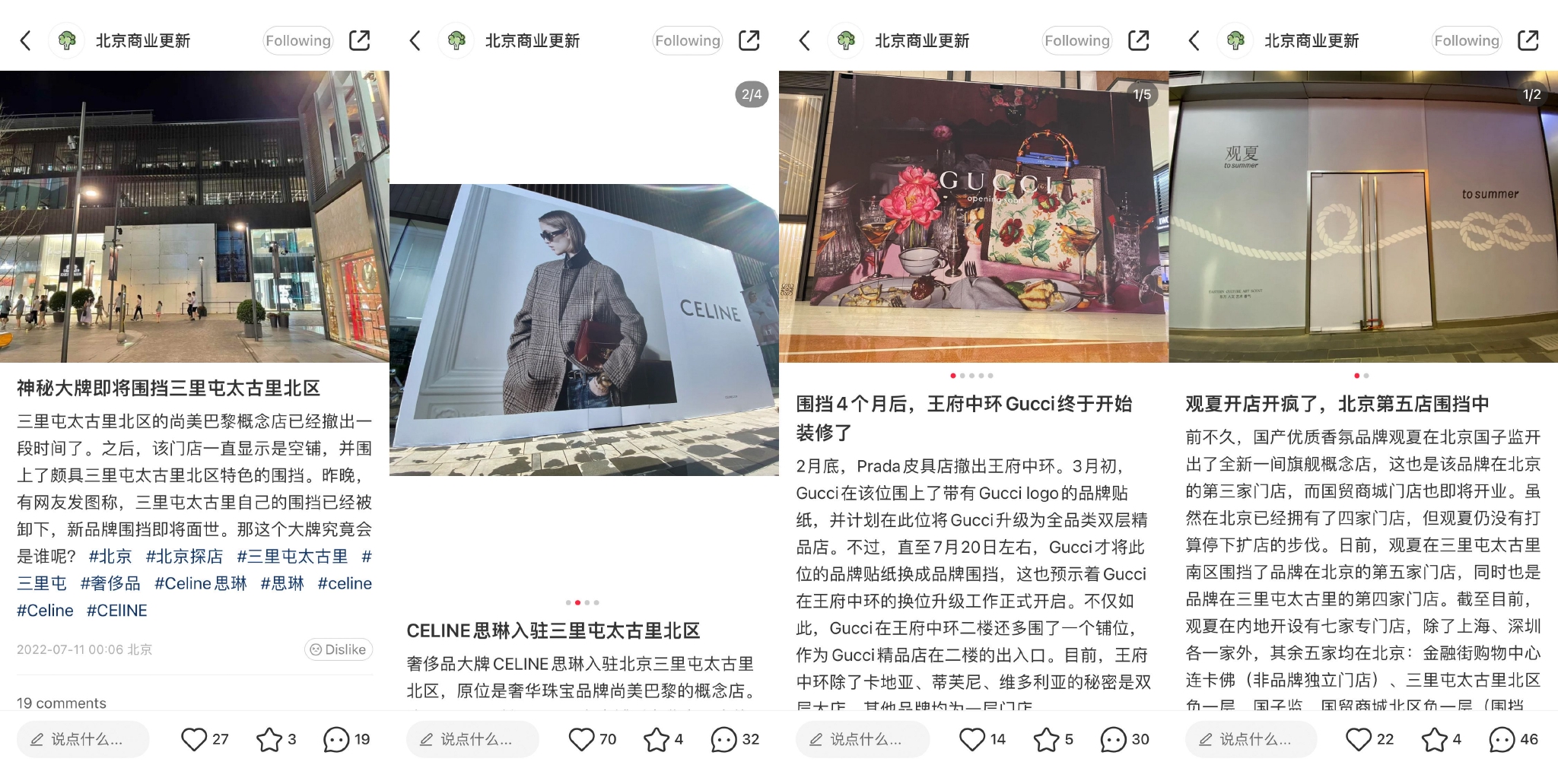 社交媒体上有一群“追围挡的人”。 第一类是“围挡博主”或“城市商业博主”。他们发布的内容通常形式统一、简约直白:三四张围挡或新店开业图,再配上一两段文字来描述品牌的商业计划和店铺分布。 另一种是博主所发布内容的消费者。他们中有人亦做博主,也有单纯的关注者。他们会围绕着围挡博主发布的内容展开丰富的讨论,或分析商业逻辑,或闲聊八卦。 刘胡杨就是其中之一。他在微博和小红书上运营名为“北京商业更新”的账号,是城市商业动向的分享者,也是这类内容的消费者。 他尽量做到每天至少更新一篇内容。信息密集的时候,个别周末偶尔也会更新三四篇。因为在周末和节假日的时候,他有更多的时间去溜达。尽管常常有网友向他投稿,但信息最主要还是由他自己出门去寻找获得。 ![]() 三里屯太古里、北京SKP等购物中心和王府井(19.690, -0.19, -0.96%)、西单等商圈,以及关注度较高的待开业新商业体,都是刘胡杨重点关注的对象。这些地方往往会有指标性的商业品牌进场。 几个月前的某个晚上,刘胡杨在小红书上看到消息称,三里屯太古里的业主方太古地产已把代表铺位空置的自家围挡撤下,取而代之的品牌围挡将在次日凌晨被装上。 出于好奇,他第二天起个大早,在北京早高峰时段就到达三里屯,结果发现围挡品牌是CELINE。这与他的预判一致。他早前已留意到这个LVMH集团旗下的法国品牌在三里屯开设了快闪店。据他的经验,品牌在某个商业地产项目内开设快闪店,很有可能就是在为进驻商铺试水。 最终,围绕着CELINE三里屯太古里店铺围挡,他在小红书连发两篇笔记。第一篇是在围挡前一晚,预告新品牌即将到来;第二篇则在次日早上9时25分发布。 让很多人或感意外的是,刘胡杨还有一份不便透露的本职工作。他一年前开始更新这个账号时,只是随意将商场的新围挡或新店拍下来,分享到社交媒体,却没想到关注这个领域的人不少,便开始有了继续分享的动力,持续更新到现在。 目前,“北京商业更新”微博账号有粉丝1.4万余人,收获点赞7.5万余次。同名小红书账号关注者近4000人,收获点赞1.2万余次。 ![]() 这个圈子里也有专职博主的存在。李大宝就在最近两年转型成了全职博主。 他从2014年左右开始运营账号“Let‘sCHUNGKING叻是重庆”,最初发布内容的平台是微博和微信公众号,2022年新开设了小红书账号。李大宝因为曾在地产行业工作过,所以更容易获取信息并对消息进行求证。 “和本地生活的探店博主相比,我更想去强调品牌围挡或店铺开业背后的商业逻辑,而不只是说这个东西好吃好玩。”李大宝说道。 不过,做了全职博主需要面对一些问题,比如没有没有新鲜事的时候,他会选择停更几天。“真的没有东西可以发,我也不会去为发而发,还是想保持账号的专注度。”他说。 而且李大宝表示自己也不想去用地域之争一类的流量密码。他理解关注重庆商业发展的网友会喜欢拿成都来与重庆做对比,但不喜欢网友们因此争吵。 “对比的内容很容易引发大家的讨论,是流量密码,但我不喜欢去用它。”李大宝说道,“碰见这样吵架的网友,我会去提醒他们,让他们不要这样做,要保持友好交流。” 好在重庆的同类博主不算太多,即使类型相同的博主,至少到目前,内容同质化竞争的情况也不严重。这给了李大宝在流量和专业度之间寻求平衡的空间。 ![]() 当然,李大宝也需要考虑“营业”的问题,即和品牌或商业地产等客户展开商务合作。基础一点的营业,就是李大宝在重庆或去成都参加品牌活动,随后在各个平台发布对应的内容。 更深度的合作是为客户定制内容,操作周期通常在两到三周。而为客户做类似广告策划的创意输出所耗费的时间更长,可能会在1到2个月左右。目前李大宝有自己的团队,创意合作的范围不局限在重庆,上海也有他的客户。 从上述运营模式看,李大宝一定程度上已将自己的账号品牌化。这也是为什么他不排斥别人用围挡爱好者来称呼自己,但认为这个称呼更多只是打趣,和他所做的内容相比,不免显得有些简易扁平。 ![]() 新消费升级、首店经济和奢侈品牌扩张等消费趋势,为社交媒体上的商业观察者和围挡爱好者们提供了谈资。而在城市排名层出不穷的背景下,对商业更新的期待和对所在城市的归属感,让更多非专业人士关注城市商业发展。 其中奢侈品牌新店围挡或开业是最受网友关注的内容,他们的关注点包括城市内的门店数量和店铺规模。而海外消费回流导致的中国奢侈品市场火热,则路易威登和爱马仕等品牌加速向一线市场之外扩张,许多网友得以加入到讨论之中。 “大家都会认为城市商业丰富度以及亮点,是靠这些中高端品牌来撑起来的。” 老白说道。“老白”在小红书上运营着账号“星城商业动态”,聚焦长沙的商业动态。 对老白而言,围挡是品牌文化的外化体现,围挡制作水平体现了品牌的创意水平,许多品牌会用围挡来进行前期营销。他见过很多这样的案例,将近8年前他就已经在论坛上活跃,至今运营账号仍是出于“公益”性质。 老白没有接广告意愿,他要保持中立。“为内容选择品牌时,我会衡量它在行业上的权重性和历史悠久性。但如果我认为这个品牌有可以挖掘的内容,哪怕只开了一两家店,我也会去探究。” 按照这个标准,奢侈品牌自然也是“星城商业动态”关注的内容,这是最受读者欢