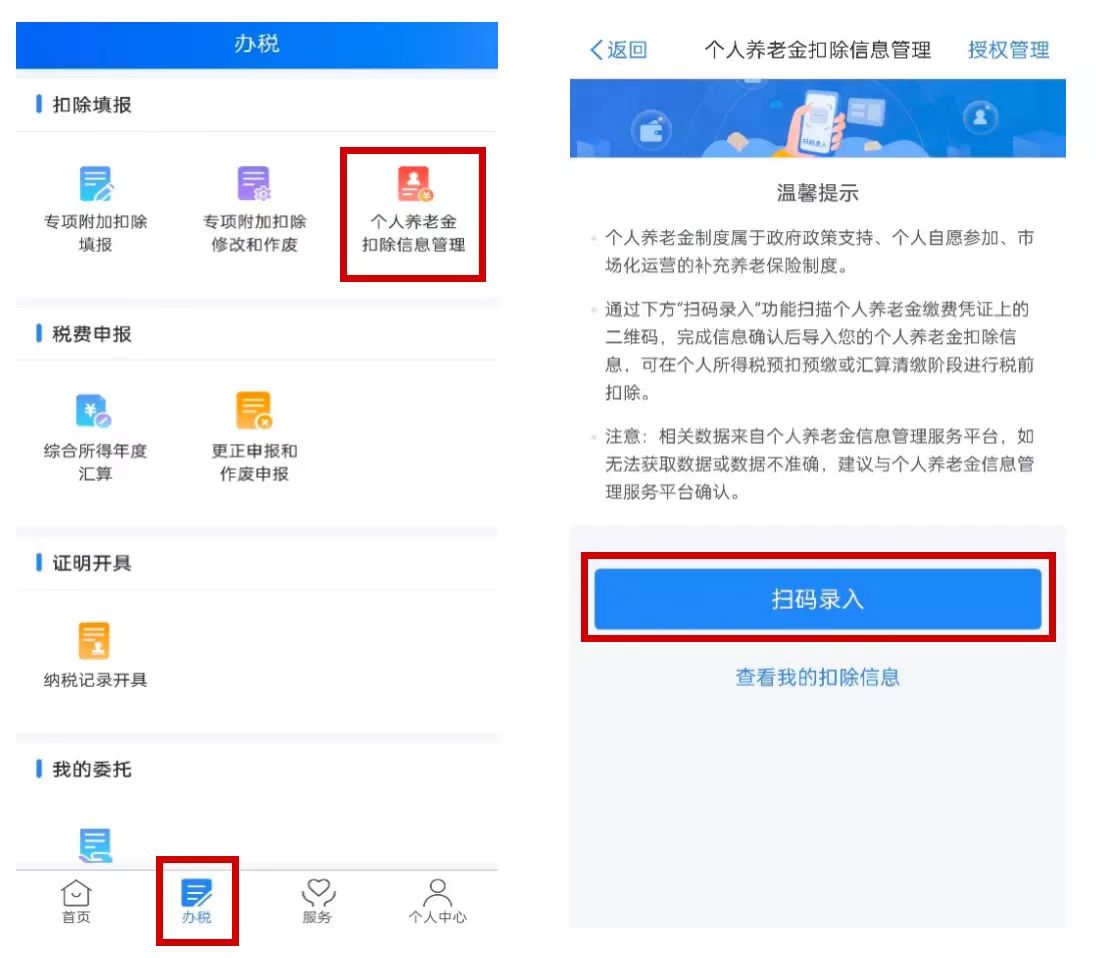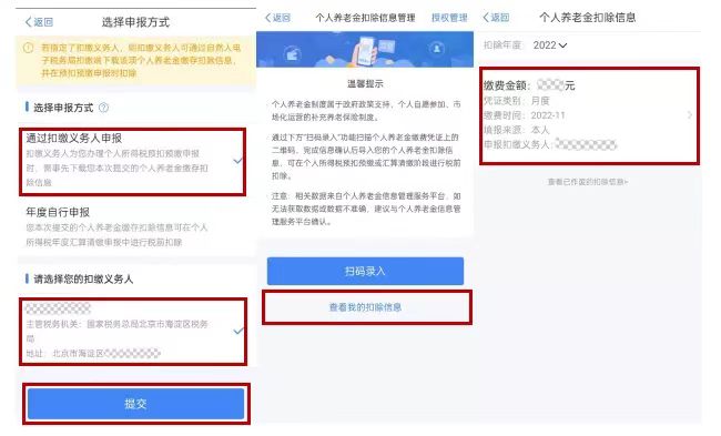 上证报中国证券网讯(记者 李苑)个人养老金个税政策规定,对个人养老金实施递延纳税优惠政策。在缴费环节,个人向个人养老金资金账户的缴费,按照12000元/年的限额标准,在综合所得或经营所得中据实扣除。 为方便纳税人及时享受政策,税务部门对办税系统进行了优化升级,纳税人通过手机个税APP填报扣除信息并一键推送给单位,在每月发放工薪时即可享受税前扣除。具体如何操作?一文教你轻松搞定! 第一步:获取缴费凭证 登录国家社会保险公共服务平台(https://si.12333.gov.cn/),进入“首页——个人养老金——缴费凭证查询打印”界面下载纳税人的个人养老金月度缴费凭证。 一般情况下,每月8日起纳税人可以通过国家社会保险公共服务平台查询下载上月的个人养老金缴费凭证。 ![]() ![]() 第二步:扫码录入扣除信息 使用个税APP右上角“扫一扫”功能,或者进入“办税——扣除填报——个人养老金扣除信息管理——扫码录入”功能,扫描个人养老金缴费凭证右上角的二维码。如果纳税人的缴费凭证是以电子方式存储在手机中不方便扫码,可以使用“扫一扫”界面右下角的“相册”功能打开缴费凭证照片。 ![]() ![]() 纳税人授权个税APP获取其个人养老金缴费数据后,个税APP即可根据扫码结果生成当月个人养老金扣除信息。纳税人核对无误后,点击“下一步”即可。 需要说明的是,如纳税人扫描的缴费凭证二维码不是本人的,将无法进行填报,系统会予以提示。 ![]() 第三步:将扣除信息推送给单位 在“选择申报方式”界面,勾选“通过扣缴义务人申报”,并选择相应的扣缴义务人,点击提交即完成申报流程,扣缴义务人收到纳税人申报信息后将为纳税人办理税前扣除。 纳税人可通过“个人养老金扣除信息管理——查看我的扣除信息”界面,查询自己申报的个人养老金扣除信息。 ![]() 注意:如果纳税人不选择“通过扣缴义务人申报”,也可以选择“年度自行申报”,则纳税人提交的个人养老金扣除信息可以在个人所得税年度汇算清缴申报中进行税前扣除。 |