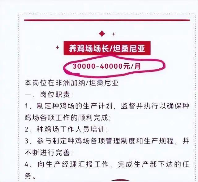 来源:新民晚报 昨天(2月23日) “企业月薪4万招人去非洲养鸡” 引发热议 山东青岛一企业称 月薪3-4万招聘养鸡场场长 工作地点在非洲坦桑尼亚 据其招聘需求显示,任职需要具备丰富的蛋种或肉种鸡饲养管理经验,熟悉种鸡饲养及疾病防治的关键控制点;做为负责人,管理过5万套以上种鸡场3年以上或大型养鸡场5年以上;畜牧兽医相关专业毕业;具备良好的团队合作能力,熟悉各种鸡场各项操作,并能给工作人员进行培训和示范指导;愿意驻外,男女均可。年薪在30万到50万之间,另外还有绩效、年假、年底奖金和飞机票。 ![]() 据媒体报道,工作人员回应称场长只要工作经验足够,是可以达到所说的工资标准的,但是该地的工作环境和国内还是有差别,比较艰苦,当地气候和国内不一样,有的人不适应当地的气候就不干了,不是所有人都可以适应的。“有很多发简历的,真正适合的不是特别多。” ![]() 工作人员还表示 场长需要工作经验足的人担任 所以不考虑20岁以下的年轻人来应聘 年轻人若要应聘只能从基础做起 对此 网友热议纷纷 有网友评论道: “有点心动, 不是为了钱只是想去磨炼一下自己。” 也有网友被劝退: “给再多钱也不去, 艾滋、疟疾、干旱…” ![]() ![]() ![]() ![]() ![]() ![]() ![]() 外交部官网显示,坦桑尼亚联合共和国面积94.5万平方公里,人口5910万(2018年),为联合国宣布的世界最不发达国家之一。经济以农业为主,平年粮食勉强自给。工业生产技术低下,日常消费品需进口。 2021年该国GDP为703.23亿美元,增长率4.9%,人均国内生产总值1190美元;通货膨胀率3.7%;外债总额278.36亿美元,外汇储备为63.86亿美元。 2月14日,中国驻坦桑尼亚大使馆发布领事提醒称,近期,坦桑尼亚卫生部发布第12号旅行提醒,调整关于国际旅行的防控举措,主要内容有: 一、建议所有入境或中转旅客来坦前完成新冠疫苗全程接种。 二、除乘坐交通工具或最终目的地国家需要,所有入境或中转旅客将不再被要求出示新冠疫苗接种证明、核酸检测证明或接受快速抗原检测。但出于疫情监测需要,边境卫生检疫部门可能随时抽取旅客进行免费快速抗原检测。 三、旅客到达后将进行体温等健康指标检测,如有相关症状,需按照有关卫生政策实施隔离等措施。 请所有计划来坦的中国公民知悉上述政策,抵坦后遵守坦方防疫规定,避免给自身带来不便。 新民晚报综合九派新闻、外交部官网、中国驻坦桑尼亚大使馆、网友评论 |