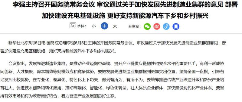 转自:中国证券报 彭扬 欧阳剑环 据新华社5月5日消息,国务院总理李强5月5日主持召开国务院常务会议,审议通过关于加快发展先进制造业集群的意见;部署加快建设充电基础设施,更好支持新能源汽车下乡和乡村振兴。 ![]() 图片来源:新华网 发展先进制造业集群 会议指出,发展先进制造业集群,是推动产业迈向中高端、提升产业链供应链韧性和安全水平的重要抓手,有利于形成协同创新、人才集聚、降本增效等规模效应和竞争优势。要把发展先进制造业集群摆到更加突出位置,坚持全国一盘棋,引导各地发挥比较优势,在专业化、差异化、特色化上下功夫,做到有所为、有所不为。要统筹推进传统产业改造升级和新兴产业培育壮大,促进技术创新和转化应用,推动高端化、智能化、绿色化转型,壮大优质企业群体,加快建设现代化产业体系。要坚持有效市场和有为政府更好结合,着力营造产业发展的良好生态。 “建设以实体经济为支撑的现代化产业体系,是实现中国式现代化的重要物质基础,而加快发展先进制造业集群则是关键所在。”东方金诚首席宏观分析师王青认为,发展先进制造业集群既可推动制造业持续转型升级,培育壮大新增长动能,改善经济发展质量,又能有效确保产业链安全,夯实科技自立自强根基。 巨丰投顾高级投资顾问于晓明表示,发展先进制造业集群是加强制造业创新和提升制造业水平的重要举措。“一方面,可加快推动中国制造业转型升级,提升我国在世界制造业中的影响力;另一方面,可带动相关产业发展,促进经济增长,提高就业水平,进一步推动区域经济协调发展。”于晓明称。 王青预计,后续财政政策、货币政策、产业政策和科技政策都将出台或强化针对发展先进制造业的政策工具。 更好支持新能源汽车下乡 会议指出,农村新能源汽车市场空间广阔,加快推进充电基础设施建设,不仅有利于促进新能源汽车购买使用、释放农村消费潜力,而且有利于发展乡村旅游等新业态,为乡村振兴增添新动力。会议审议通过了加快推进充电基础设施建设、更好支持新能源汽车下乡和乡村振兴的实施意见。会议强调,要聚焦制约新能源汽车下乡的突出瓶颈,适度超前建设充电基础设施,创新充电基础设施建设、运营、维护模式,确保“有人建、有人管、能持续”。要引导企业下沉销售服务网络,鼓励高职院校面向农村培养维保技术人员,满足不断增长的新能源汽车维修保养需求。要进一步优化支持新能源汽车购买使用的政策,鼓励企业丰富新能源汽车供应,同时加强安全监管,促进农村新能源汽车市场健康发展。 国家发改委新闻发言人孟玮说,国家发改委将加快推进充电桩和城市停车设施建设,大力推动新能源汽车下乡,鼓励汽车企业开发更适宜县乡村地区使用的车型。同时,加快实施公共领域车辆全面电动化先行区试点。 于晓明表示,预计相关部门将加大对新能源汽车下乡和乡村振兴的支持力度,推动充电基础设施建设,为新能源汽车在农村市场的发展创造更好的环境,也将有助于提高农村地区的交通便利性和新能源汽车的普及率,促进农村经济发展和环保事业。 在新能源汽车下乡方面,不少地方已有动作。据陕西省人民政府网站,4月27日,2023年陕西省新能源汽车下乡活动启动,同时启动的还有西安市新能源汽车进机关、下企业、入园区团购推广活动。 无锡市人民政府办公室日前印发的《无锡市2023年度促进新能源汽车推广消费的若干政策措施》也提出,大力开展新能源乘用车促消费活动,开展新能源汽车下乡、鼓励个人购买新能源汽车。 此外,在加快推进充电基础设施建设方面,国家能源局发展规划司副司长董万成日前表示,加快推进县乡村充电基础设施建设。着力推动县城、乡镇公共充电基础设施布局建设,探索充电设施与光伏、储能相结合,加大县乡村充电网络建设运营支持力度,为新能源汽车下乡创造良好条件。 |