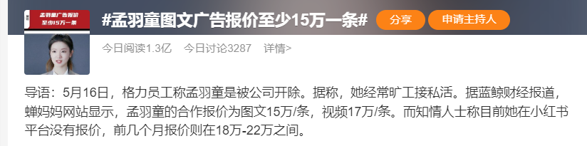 近日,孟羽童从格力“离职”一事,引发热议。有媒体报道称,从孟羽童“离职”前所在的格力市场部员工处获悉,孟羽童不是离职,而是“经常旷工接私活被开除”。 5月17日,格力电器(34.560, 0.54, 1.59%)就此事回应称:“感谢广大网友的关心!祝愿孟羽童和广大网友一切都好!”落款为格力文传中心。 网友表示,“说了但又什么都没说”“一个给人画不可能实现的饼,一个想当网红,不是一路人。” 广告视频17万/条 业内:专业团队操刀可年入千万 17日,#孟羽童图文广告报价至少15万一条#热搜,再度引发关注。 ![]() 据蓝鲸财经报道,蝉妈妈网站显示,孟羽童的合作报价为图文15万/条,视频17万/条。而知情人士称目前她在小红书平台没有报价,前几个月报价则在18万-22万之间。 《每日经济新闻》记者梳理发现,在小红书个人号“孟羽童Morita”上,截至目前归类于“创意广告”的内容有19条,均为商务广告短视频。最早一条“创意广告”视频是在2022年3月6日发布,推广某知名品牌面霜;从时间线上看,去年9月开始,孟羽童几乎每个月都会更新发布不少于1条创意广告视频。从推广的产品品类来看,前期孟羽童商务合作品牌主要是大牌化妆品、护肤品、香水等。从今年2月开始,孟羽童所接的广告客户扩展到了电子产品、汽车。 如果按18-22万每条计算,孟羽童一年多来仅小红书广告收入或许就能接近400万元。 截至目前,孟羽童微博粉丝数超27万,小红书粉丝数超120万,抖音粉丝数超200万。 ![]() 据21世纪经济报道,一位直播电商领域资深人士告诉记者,孟羽童拥有120万粉丝,在小红书平台算超级大V,月广告收入约在10万-20万元之间。他认为,漂亮的职场精英,这个人设,更容易拿到一些大牌广告。孟羽童确实接了一些广告生意,合作方包括vivo、惠普、阿玛尼、华为、沃尔沃等品牌。她制作了一系列精致小短片,比如惠普的广告内容就是讲职场精英的工作风格。她坦承,没有专业团队,平台上的视频,是和一个摄影师朋友做的。“她应该没有和专业的广告公司合作,来提高变现能力。若有专业团队操刀,一年1000万元的广告收入,不成问题。”上述业内人士感慨,在公司上班,肯定有诸多限制。 有网友感慨:“估计在格力退休都赚不到这么多”。 ![]() 在格力月薪五千到一万 曾被董明珠当接班人培养 公开资料显示,孟羽童毕业于浙江大学2017级西班牙语专业。 董明珠和孟羽童的相识于一档2021年播出的综艺节目《初入职场的我们》。在节目中孟羽童凭借出色的表现,获得董明珠的赞许,并被董明珠纳入麾下。 ↑图据孟羽童微博2021年9月,孟羽童正式入职格力电器。目前,孟羽童个人微博置顶内容仍是当时入职时发布的内容,第一张图片显示其职务为董事长秘书。 入职后,孟羽童颇受董明珠重视。2021年10月召开的中国制造业领袖峰会上,孟羽童和董明珠一同现身,董明珠还在活动现场表示,“要将孟羽童培养成第二个董明珠”,此话一出,引发大量关注。 此前外界曾传言董明珠对其开出了百万年薪,但只有12万元为基础薪资,其余则是绩效与销售达标后的效益工资。孟羽童在视频中否认了百万年薪的说法。 她在视频中透露了在格力的薪资情况,“其实我的工资和格力应届大学生的水平是一样的,基本上在五千到一万块钱这个区间内。” 但5月11日,孟羽童在个人账号发布视频回应自己离职格力。她表示,无论是自己还是大家,经历这样的一个人生变动,都没必要把它当成一个消极的事情,只是我们人生某一个阶段的选择而已。 |