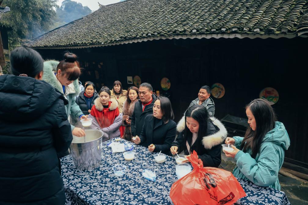 2024年1月16日,在湖南省怀化市沅陵县借母溪乡借母溪村,游客在品尝手工豆花。新华社记者 张铖 摄