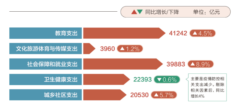 实现好、维护好、发展好最广大人民根本利益,是党和政府工作的出发点和落脚点。 2023年,尽管财政收支压力很大,但民生投入力度不减。超过27万亿元全国一般公共预算支出中,教育、社会保障和就业支出都在4万亿元上下,卫生健康、城乡社区支出都超过了2万亿元。