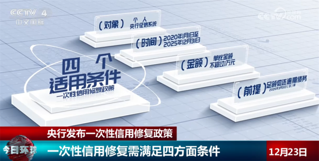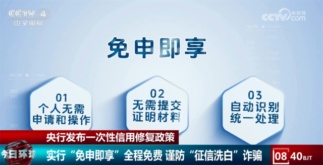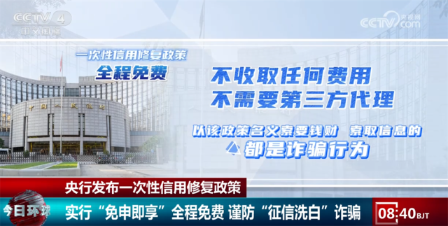 北京银行行长戴炜称:“以每月10日偿还1000元等额本息贷款为例,若截止到2025年12月31日尚有2000元的逾期欠款,则借款人需要在2026年1月10日前同时结清往期的欠款2000元以及当月应还款1000元,合计3000元。” 政策实行“免申即享” 全程免费 同时,一次性信用修复政策实行“免申即享”,个人无需申请和操作,也无需提交证明材料,由央行征信系统对符合条件的逾期信息进行自动识别和统一处理。央行提醒,一次性信用修复政策不收取任何费用、不需要第三方代理,任何以该政策名义索要钱财、索取信息的都是诈骗行为。