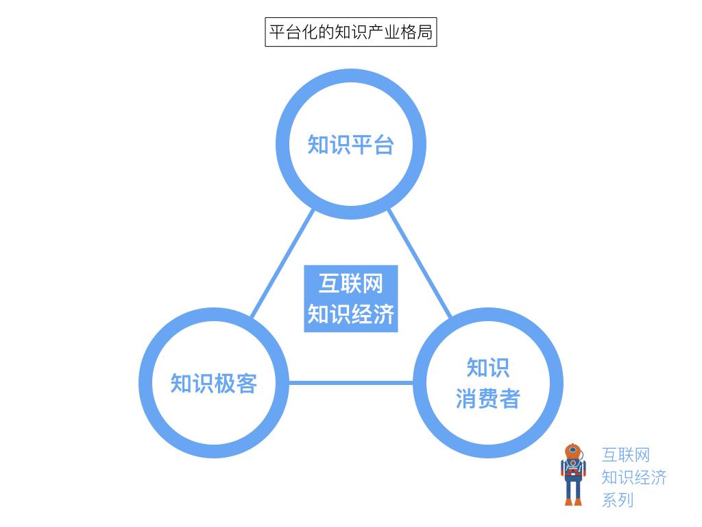 知识的创造与消费包括四个阶段:知识创造、知识产品化、知识消费和知识应用。其中,知识产品化是互联网知识经济极其关键的环节。消费者在知识市场中购买的、付费的不是知识,而是转化为产品或服务的知识。用户是在为知识产品付费,用户是在为知识服务付费。 知识产品化比较重要也是因为,过去,知识并没有像普通商品或服务经历过这个过程,知识只是凝结在商品或服务之中,藏在iPhone手机、汽车、酒店服务、金融服务里。现在,要离开实物商品或生活服务,独立地售卖知识,信息与知识就需要经历这个产品化的过程。 消费者接受信息与知识,往往需要解读和解码的过程,产品化也是确定什么帮用户解读好、什么留白给用户这个界线。图书需要我们较多的解码努力,而视频则很少留白,可以当成轻松的、被动的娱乐。 在互联网知识经济浪潮兴起时,在生产方出现很多知识明星、平台开发者与工作人员、支撑知识明星和内容制作方的专业人士等,他们是知识的创造者,解读者,传播者,传授者。这群人可以称为“知识极客”、“知识匠人”,具体可以细分为五大类别: