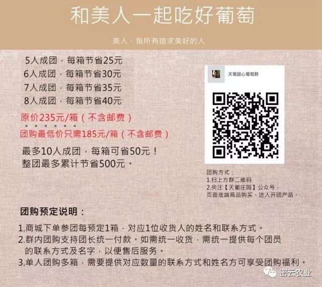 小孩子的感官比大人灵敏,他们嘴刁,一般的东西入不了他们法眼,挑食还挑不过来呢。浓香、无核、不用剥皮、吃起来像撸串一样!让孩子们开心、满足。 旭旺葡萄是欧亚品种,该品种是早熟无核葡萄品种,粒重3-4g,近圆形,黄绿色,果皮薄,着生松紧度适中。果实总含糖量18.9%,含酸量0.25%,含可溶性固形物22%。 天葡庄园种出的旭旺葡萄,会带给您“众里寻她千百度,终于相遇在此处”的感觉。一粒果实,悦人的芬芳与新鲜,沁人心脾的甜蜜与爽口。 想了解旭旺葡萄的种植过程请点击下方图片 [1] 添加客服微信1311491354/13581820249 [2]关注【天葡庄园】公众号,页面底端商品购买,进入开团产品。 [3] 扫下图二维码入群。 [4]点击文末阅读原文直接购买。