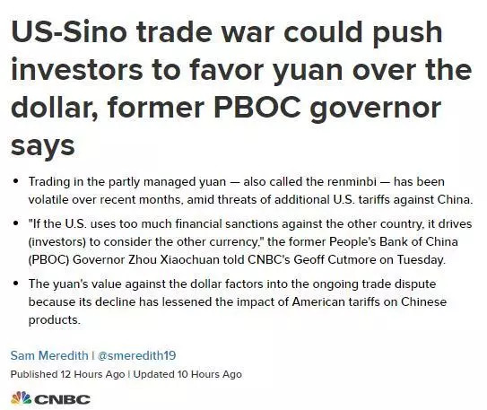 外媒:拜贸易战所赐,人民币更受欢迎了 最近,有外媒称,由美国发起的贸易战反而会让人民币在国际交易中的地位得到提升。 9月9日,香港《南华早报》发文称,美国发起的贸易战实际上正在帮助中国实现其梦寐以求的长期金融目标之一:在国际贸易和金融交易中更多地使用人民币。 ▲《南华早报》报道截图:“中美贸易战正帮助中国提升人民币在国际交易中的使用”。报道称,根据中国工商银行(5.300, -0.04, -0.75%)香港分行的数据,截至二季度末,海外机构和个人持有的以人民币计价的金融资产总额为4.9万亿元(约合7170亿美元)。其中,以人民币计价的股票和债券在全球投资者持有的总资产中所占的比例分别增至约2.5%和3.0%。 报道还称,要追上甚至取代美元成为世界上最受欢迎的交易货币,人民币还有很长的路要走。但美国的制裁给中国及其一些贸易伙伴带来的压力促使一些经济体重新考虑其对美元的依赖。 今晨,美国CNBC也发文称,前央行行长周小川在接受采访时表示,中美贸易战可能会令投资者更倾向于人民币而不是美元。 ![]() |
