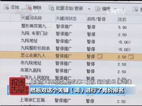 《每周质量报告》真假九院 日前,上海市工商局对一起医疗美容医院的虚假宣传案进行立案调查。与以往同类案件不同的是,这起案件中被调查“上海华美医疗美容医院有限公司”刚刚因为同一违法行为被工商部门处以20万元的罚款。前脚刚刚交完罚款,这家美容医院后脚又立即恢复了虚假宣传。这家医院究竟要闹哪样? 假借正规医院之名 美容医院诱骗患者就诊 事情的经过,还要从一年前说起,去年5月,上海交通大学医学院附属第九人民医院到上海市工商部门进行投诉,反映一家名为上海华美医疗美容医院有限公司的机构假冒上海交大九院的网站,诱骗患者就诊。 工商部门接到投诉后,立即登陆到被举报网页查看,网页最上端清楚地写着“第九人民医院指定单位——上海华美医疗美容医院”,旁边还有一个标注着九院专家的医生形象。 网页左侧的弹窗上写着第九人民医院咨询挂号中心特需门诊的电话,并显示这个聊天窗口可以提供患者与第九人民医院整形美容专家在线对话。这个乍一看上去并无问题的网页有什么蹊跷? 一番调查后发,工商部门发现,网页弹窗中所谓提供咨询的专家根本不是九院的专家,而是当事人华美医院聘请的网站维护人员;网页开头的医生形象也不是九院的医生,仅仅是当事人的聘用医生。 利用百度竞价排名 “山寨”医院成功上位 工商执法人员在很短的时间内就掌握了上海华美医院的违法行为,但是这些违法行为却让执法人员陷入了更深的迷惑。互联网上的网站千千万万,像上海华美医院这样一个不知名的医院和官方网站,是怎样进入广大消费者视线的? 执法人员进一步调查发现,华美医院利用了百度中的竞价排名机制,只要患者在该搜索引擎中搜索“九院”“九院官网”“九院地址”等包含有“九院”元素的词语,搜索结果排名第一的就是华美医院通过最高竞价而占据的网页链接。患者一旦点击这些网页链接,就会被引入华美医院的假冒网站。